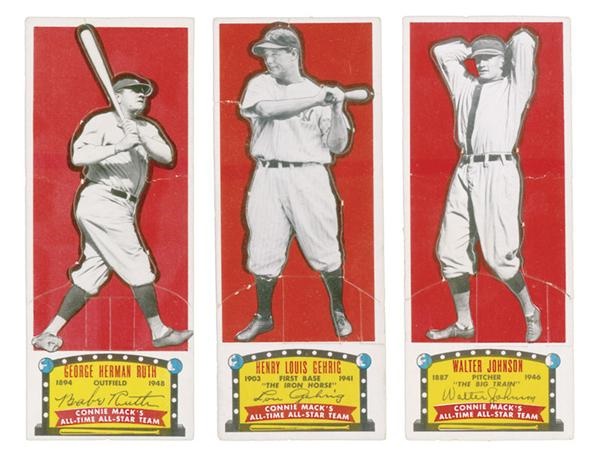 A landmark set issued by Topps during the company’s first year in the baseball card business. Why not capitalize on the greatest names the game has ever known? The venerable manager Connie Mack selected his All-Time team (with Ty Cobb conspicuously absent) of 11 players. These large cards were die-cut to allow enterprising youngsters to stand and adjust their favorite ballplayers. These cards are rarely seen at all, especially intact. As is the case with "die cut" cards, the background could be easily removed enabling the cards to stand on their own. Consequently, very few examples still exist fully intact. This offering contains the three most valuable cards in the set and, arguably, the most popular duo to ever wear pin stripes, Babe Ruth and Lou Gehrig. All three cards show evidence of creasing but as evidenced by our photo, all three present beautifully. Includes: Babe Ruth - perforation appears intact, crease horizontally across middle. Grades technically GD-VG but presents much nicer. Lou Gehrig - perforated along majority with creasing that touches his head. Grades technically FR-GD. Walter Johnson - perforated along half the card with the right border separated from the hinge. Crease horizontally across middle plus a small dark stain on the reverse. Grades technically FR. The bold red background on each enhances the black and white action shot of these early legends of our national past time. When was the last time you saw 51 Connie Mack All Stars? How many can still exist? A great addition to any collection with investment potential written all over this offering. A trio of scarce and popular cards from Topps’ first year in baseball.