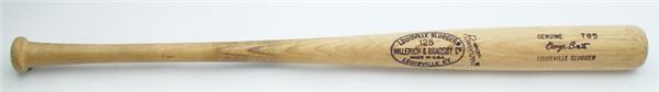 Fabulous Hillerich & Bradsby T85 gamer used by the Hall of Famer who defines the Kansas City Royals franchise. Over the course of his 20-year star-studded career with the Royals, Brett would lead the team to 6 AL Championships and 2 World Series. He retired as the team’s all-time leader in every offensive category except stolen bases. All stampings on this beatific piece of lumber are bold and prominent, from his facsimile signature to the H&B logo. Nice use with pine tar residue and smattering of marks on the barrel, slightly cracked handle. Written on knob in black marker is “GB 5”.