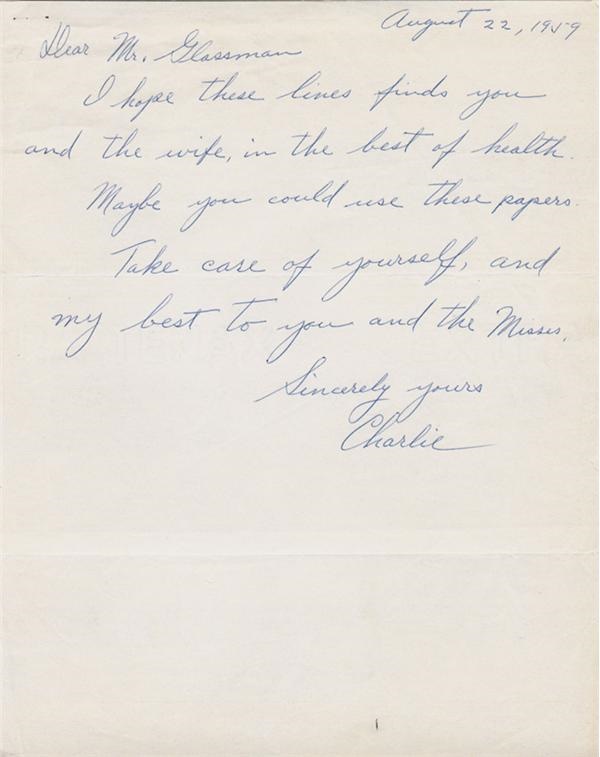 Handwritten letter from Mafia boss Lucky Luciano postmarked from Rome, Italy in August of 1959. He had been deported in 1946 after serving time in the U.S Federal prison. It has been alleged, but denied by officials, that while in prison, he assisted the U.S. Military in planning the invasion of Sicily in 1943. By the time this letter was written he was heavily involved in the Italian black market and international narcotics traffic. The letter reads in full: “Dear Mr. Glassman: I hope these lines finds you and the wife, in the best of health. Maybe you could use these papers. Take care of yourself, and my best to you and the Misses. Sincerely yours, Charlie”. With an envelope addressed to Mr. Barnett Glassman in N.Y.C. Condition of the letter is EX and the signature and text is NRMT. Letter measures 8.5x11”.