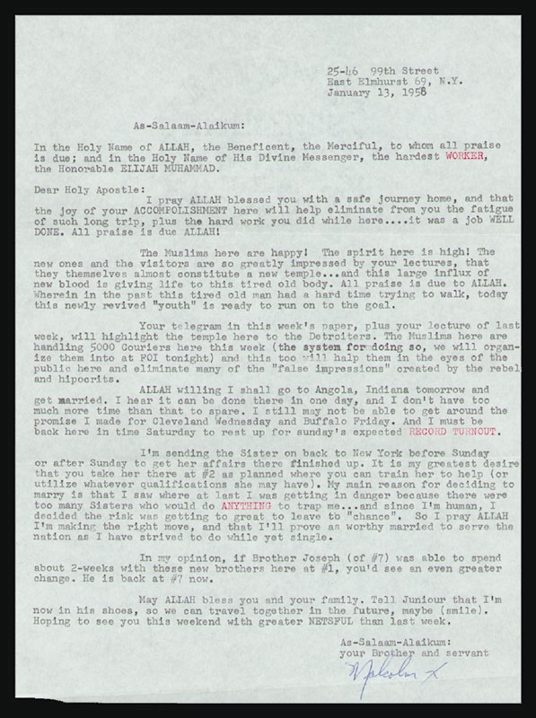 Offered is one of the most important and insightful letters extant from Malcolm X, the Nation of Islam’s most eloquent spokesman. Addressed to Elijah Muhammad - one of the Nation of Islam’s most powerful leaders - the content and circumstance of this typed, signed letter is invaluable. Read in fascination as one of the most renowned Civil Rights speakers in history reveals his reasons for marrying. Letter reads in part: “Honorable Elijah Muhammad…The Muslims here are happy! The spirit here is high! The Muslims here are handling 5000 Couriers here this week…and this too will [help] them in the eyes of the public here and eliminate many of the ‘false impressions’ created by the rebels and [hypocrites]…ALLAH willing I shall go to Angola, Indiana tomorrow and get married. I hear it can be done there in one day, and I don’t have too much time than that to spare…I’m sending the Sister on back to New York before Sunday or after Sunday to get her affairs there finished up. It is my greatest desire that you take her there at #2 as planned where you can train her to help…My main reason for deciding to marry is that I saw where at last I was getting in danger because there were too many Sisters who would do ANYTHING to trap me…and since I’m human, I decided the risk was getting [too] great to leave to ‘chance’. So I pray ALLAH I’m making the right move, and that I’ll prove as worthy married to serve the nation as I have strived to do while yet single…Malcolm X.” Letter typed on 8.5x11” paper. Signed in blue ballpoint. Signature grades a strong “8” out of a possible 10. EX-MT condition.