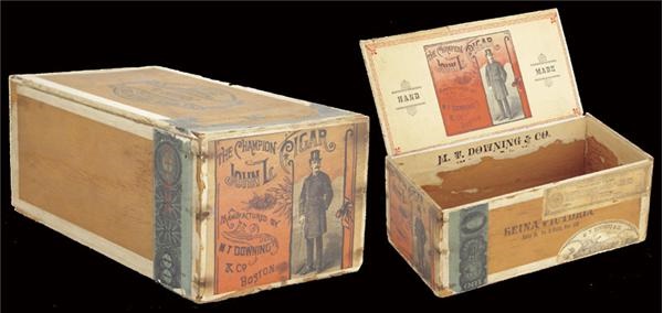 A phenomenal piece of 19th century New England artistry is this cedar cigar box. Theme is the Boston Strong Boy, John L. Sullivan. Features design burned on the top of the lid with the words, “The Champion John L. Cigar.” Underneath the lid is pasted-on graphics of Sullivan in gentlemen’s clothing and “The Champion John L. Cigar, manufactured by MT Downing & Co. Boston.” The same design is pasted on the left side of the outside of the box. The rest of the paper which once lined the inside of the box is now almost completely removed. Certificate for “Cigar Makers International Union of America” & “M.T. Downing & Co.” labels still pasted to outside. Front of box with burned on lettering, “Reina Victoria.” VG-EX condition.