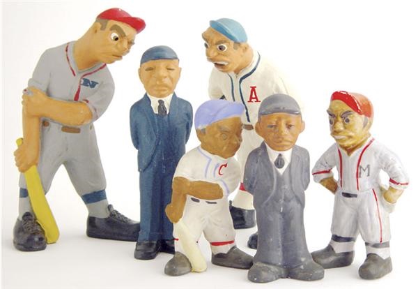 Most unusual and wonderful find of these humorous Rittgers plaster figurines in fine, EX-MT condition. 6 figurines altogether (makes up two sets), including two batters, two umpires, & two pitchers. The pitchers and batters all have angry looks on their faces, the umpires are seemingly aloof and unaffected. Wonderfully painted with virtually no chipping or paint loss! The batters wear the numbers “7” and “4” on their uniforms. The pitchers wear the numbers “5” and “8”. You can pose them any way you want: make the players glower at each other in a standoff, or make them gang up on the umpires. Shortest figure is 5” tall, tallest is 8”. One umpire and the 2 of the largest players carry the signature, “L.L. Rittgers, 1941.”