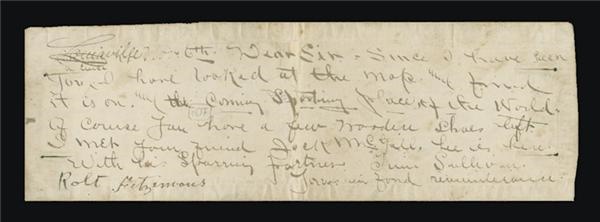 The most unique handwritten letter we have ever come across. Shortly after claiming the heavyweight crown in 1897, Bob Fitzsimmons wrote this letter on a starched cuff, addressed to his friend James Roach in Evansville, Ind. The cuff, which has since acclaimed national attention, has been in the possession of Al Stewart of Charlotte, N.C. Stewart, who had shown interest in the cuff letter while doing carpentry work for Roach in Indiana, was eventually given the item as a gift. The letter, dated Nov. 6, 1897 reads, “Dear Sir - Since I have seen you, I have looked at the map and find it (Louisville) is on, and the coming sporting place of the world. Of course, you have a few wooden shoes left. I met your friend Jack McGill, he is here with his sparring partner, Tim Sullivan. Yours in fond remembrance, Robt. Fitzimons.” As you can see, the champ has misspelled his own name. As a matter of fact, he was illiterate to a degree that inhibited him from even writing this letter. As explained by Al Stewart, Fitzsimmons had another friend actually write the letter for him, upon arriving in Louisville, then signed it afterward. The black fountain ink is thick, bold, and still completely legible. The address side of the cuff bears the handwritten address of “Mr. James Roach.” The remains of a 2-cent stamp is still visible along with the postmark stamp, “Louisville Ky. Nov. 6. 7 p.m., 97.” Other postal marks show it was received in Evansville at 9 a.m. the next day. The 11.5” cuff was actually folded and mailed. Two slits for the cuff links on either side of the “letter” of this heavily toned artifact.