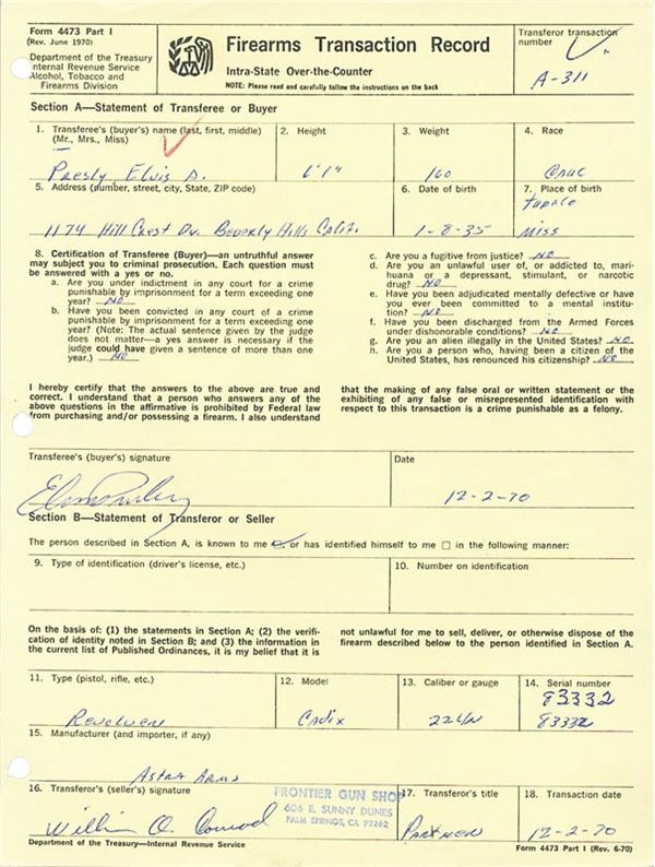 Department of the Treasury Firearms Transaction Record form for the purchase of his 22 Astra Arms Cadix revolver from the Frontier Gun Shop in Palm Springs, CA. Signature is NRMT in blue ballpoint under buyer’s signature. He answered “No” to eight questions including: if he was an unlawful user of, or addicted to marijuana, depressants, stimulants, or narcotics. In NRMT condition, with a couple of office notations and three-holes punched. 8x10.5”.