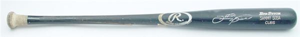 The Chicago Cubs hero is one of the newest members of the 500 home run club. The only question is how many will he end up with when he’s done slammin’ those long balls. He is the premier power hitter in the game, next to maybe Barry Bonds, and this black Rawlings Big Stick 170B is direct proof of that. Great use from the season preceeding the historic summer of McGwire's & Sosa's famous home run race with whole ball marks indented on the barrel, pine tarred and cracked handle. Slammin’ Sammy’s signature tape at bottom of handle around the knob. Capped with a silver sharpie autograph on the barrel.