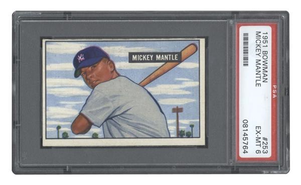 Mickey Mantle’s career flourished during the same time that baseball card collecting became widely popularized. He is remembered as being arguably the best player of the modern era. It is for this reason that this #253 high number Rookie card from the 1951 Bowman set is one of the most highly coveted cards in the hobby. Offered is Mantle’s true Rookie card, the key to the 1951 Bowman set. Graded PSA 6 EX-MT by PSA, a fine example, slightly OC (top to bottom). Corners are sharp and colors bold. No set is complete without the presence of this one.