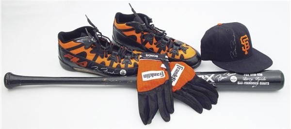 His long drives and questionable drive will one day be the subject of folklore but for now he is the reigning king of the diamond. Offered is an amazing ensemble of game used items from the games premiere player: a 1998 game used Stix black bat featuring his number “25” in silver pen on the knob, great tar, phenomenal game use, ball and rack marks, a “25 Barry Bonds Authentic" sticker, and a gorgeous Barry Bonds signature in silver pen on the barrel; a pair of Fila orange and black cleats, showing great game use signed in silver on the right cleat; also with Bonds’ authenticating sticker, a pair of Franklin batting gloves, with “Bonds” stamped in white on both wrists; and a game worn New Era, San Francisco Giants cap, size “7 ?”, signed “Barry Bonds” to the left of the “SF” logo. LOA.