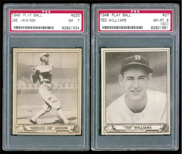 If you’re looking for a nice group of PSA 7 & 8's from the 1939 and '40 Playball issues, then this collection is for you. Lot features two of the best and most interesting players of all time-1940 Playball #225 Shoeless Joe Jackson PSA 7 (well-centered) and #27 Ted Williams PSA 8 oc. Balance of the grouping includes: 1939 Playball: PSA 8- #46, 71 Pearson, 75, and 90. PSA 7- #74, 76, 94 Manush, 122, 128, 133, 148, 149, 155, 159, and 161. 1940 Playball: PSA 8- #50, 73, 84, 94, 107 A. Vaughan "8 oc, 117, 151, 184, and 214. PSA 7- #153 McKechnie, 158 T. Jackson, 178 Carey, 181, 182, 183, 188, 189, 193, 197, 198, 199, 201, 206, 210, 217, 215, 221, 227 Haines, 228, 229, 236 Bottomley, and 240 (last card in set). There are nine more 1940 Playball's graded PSA 5's and 6's, led by Mathewson PSA 6 oc and Faber PSA 5. Additionally there are twenty-seven ungraded 1940 Playball's led by Sisler, Homerun Baker, and Ferrel. They average EX. A perfect way to upgrade your 1939 and '40 Playball sets!