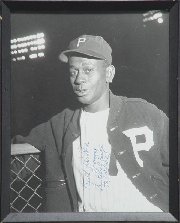 We could all take a lesson in showmanship from this Negro League legend. He was known for sending all his outfielders into the dugout while he took the mound, mowing down the Negro Leagues’ most skilled hitters with the greatest of ease. Satchel Paige pictured in this framed black & white wearing the Pittsburgh Crawfords uniform with which he would enjoy his most successful years in the Negro Leagues (1931-36, although photo was taken after this period). Signed in blue ink, “Best Wishes From Satchel Paige (to Allie).” Signature is an “8” out of a possible 10. Photo is EX-MT.