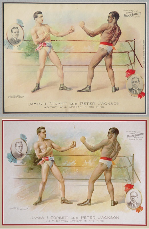Two amazing supplements are full color inserts to this Richard Fox publication. The first is a huge 17x22” and shows the two combatants going at it. It is from the May 19, 1894 issue. It has the original vertical crease. The second is about 14x11” and is the exact same image with some minor creasing. Both are o/w EX in appearance but are matted so they do not show edges.