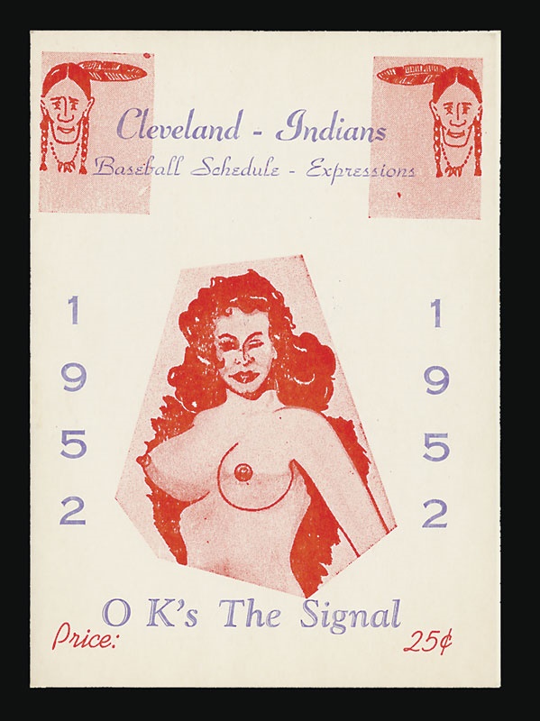 Rare and risque pocket-sized schedule from the 1952 Cleveland Indians featuring various images of bare-chested women alongside comical captions. This EX-MT piece of memorable memorabilia was originally created and distributed through “Ernie’s Print Shop” in Cleveland.