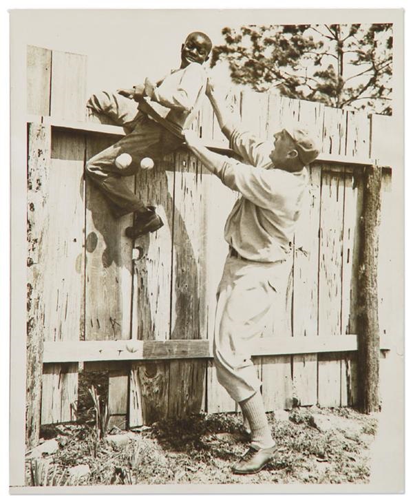 This black & white photograph tells it all, a sign of the times. Hall of Famer, George Kelly (coach) poses for this disparaging shot with who was known as a “pickaninny”. The young Black child has been “caught in the act” of stealing baseballs, trying to jump the fence, as George Kelly grabs him by the collar and the seat of his pants. This depiction is an accurate representation of popular Black roles during the early art of the century in films, and any form of media. Long before the coming of Jackie Robinson, this photo is vintage and in Excellent condition with some light surface scratches (only visible upon close examination) and a few small creases.