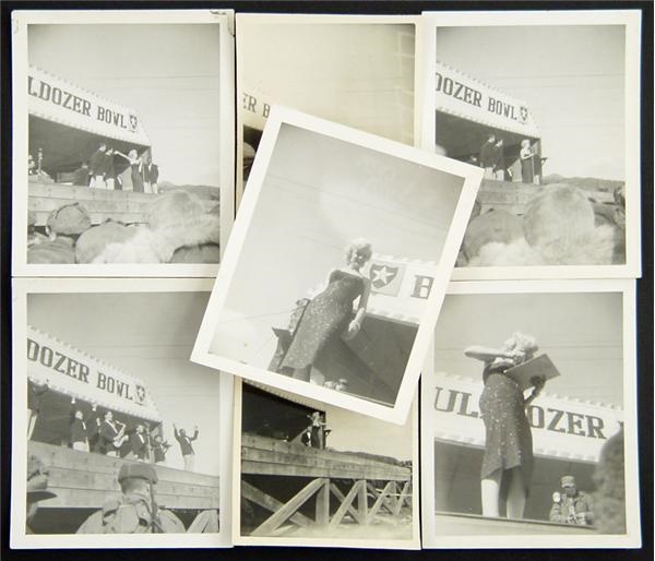 Near the end of Marilyn and Joe’s honeymoon in Japan, she accepted a request to go on tour to perform for troops stationed in Korea. Against Joe's staunch disapproval she would go ahead and entertain more than 13,000 soldiers at one army base alone. These 3.5x4.5” black and white photos, taken by one of the star struck servicemen feature the blonde bombshell during that sultry show of support. Never before seen, each image has “M.Monroe Korea '54” written in blue fountain pen on the verso while three of the pictures are lightly toned. Overall EX-EX-MT
