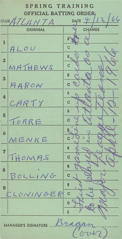 On Tuesday April 12, 1966 major league baseball arrived in Atlanta as the Braves fell in their inaugural game against the visiting Pirates. From that game we offer the two lineup cards, each 3.75x7”. Inked on those cards are such names as Aaron, Mathews, Clemente, and Alou. EX. Also included is a ticket stub (EX-MT) in its original mailing envelope (VG) from that evening’s game and an “Official 1966 Schedule” (VG).