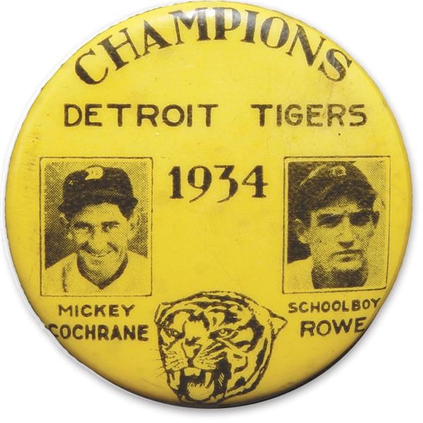 The images of Mickey Cochrane and Schoolboy Rowe adorn the front of this vibrantly colored pin from the Tigers glorious season of '34. In black lettering is “Champions” and “Detroit Tigers 1934”, near the bottom is a matching team logo. Overall the face is clean with only minor scratching while the stamped verso shows some light rust spotting. EX.