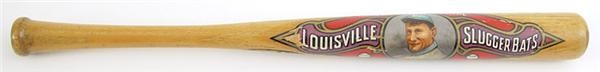 The name Honus Wagner is legendary on so many levels. His baseball card is the most highly recognized and desirable acquisition in the hobby. The first player ever to have his name on a Louisville bat was also one of the first to have his face on a Louisville mini decal bat. This fine example, a miniature Hillerich & Bradsby 40WJ sports a lovely decal on the barrel, 95% intact with the picture of his face 99% intact. 100% original.