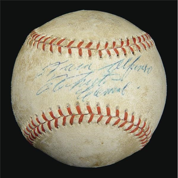 Non-official ball boasts the kind of use attributed to a “playground” game, as well as the sweet spot signature of one of the most important names in all of baseball, Roberto Clemente. In turquoise ink on the sweet spot, “For Alfonso, Roberto Clemente.” This signature no doubt started as a twinkle in a young boys eye, a young admirer of the Puerto Rican legend, who got it personally signed. It looks to have been the youngster’s personal ball, sporting scuffs and scrapes from concrete. It is now a rare and coveted piece of baseball memorabilia. Signature grades about a "5" out of a possible 10. No visible stampings on the ball.
