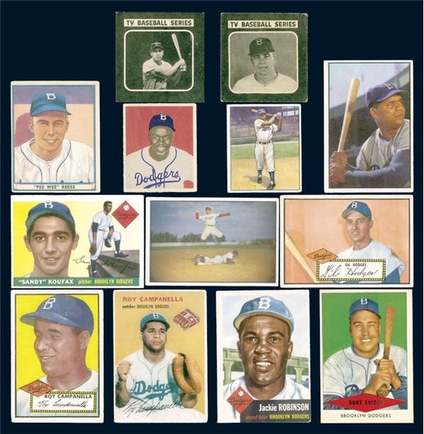 All Dodgers, all the time. That’s what makes this collection so great! 701 Brooklyn Dodgers are present-this is the result of a lifetime effort of collecting by one man. It looks as though most of the Dodgers team sets from various respective years are complete. Some of the many highlights grade as follows: 1941 Playball Reese rookie (VG), 1948 Leaf Robinson (writing on verso, PR-FR), 1949 Bowman Robinson rookie (VG), Hodges rookie (EX to EX-MT), Campanella rookie (FR), Snider rookie (GD), 1950 Bowman Robinson 2nd year (VG-EX), 1950 Drake’s Hodges (EX) & Reese (GD-VG), 1952 Topps Campanella (VG-EX), Hodges (VG-EX to EX), Snider (VG), Robinson (GD), Reese (trimmed on top o/w NRMT), 1953 Bowman Color Reese (EX), Campanella (EX), Hodges (EX-MT, oc), Snider (VG), 1953 Topps Robinson (VG-EX), Campanella (VG-EX), Reese (EX+), 1954 Wilson Wieners Campanella (pen writing on verso o/w GD) & Erskin (VG-EX to EX), 1954 Red Heart Snider (NRMT), 1955 Topps Koufax rookie (VG-EX to EX) & 1956 Topps (VG-EX) Koufax, 1955 Topps Double Header Robinson (NRMT, oc). In addition there are 52 other assorted Dodgers stars of Snider, Campanella, Hodges, Reese, Robinson, Koufax, Furillo, Newcombe, Lasorda, Drysdale, etc. Also included in the collection: 25 Dodgers from 1933 & ’34 Goudey and 1935 Diamond Stars. These average VG to VG-EX. 39 from 1939-1941 Playball average EX. 8 from 1941 Playball average VG to VG-EX. 4 1947 Homogenized Bond Bread Jackie Robinson average PR-FR. 24 1949 Eureka sportstamps average NRMT. 4 1950 Drake’s average VG-EX (2 are trimmed). 28 from 1952 Topps average EX. 1952 Coca-Cola Playing Tips Hodges (PR). 17 1954 NY Journal-American average VG-EX. 7 1955 Topps Double Header average VG-EX. 78 1953-1958 Topps average EX to EX-MT. 90 1948-1955 Bowman average EX to EX-MT. 5 1953-1955 Stahl-Meyer Franks average PR-FR. 1953-1955 Red Man average EX (14 are w/o tabs). 71 Other miscellaneous Dodgers including Scoops, Red Heart, Red Backs, Berk Ross, Swell Sport Thrills, ’38 Goudey, Tip-Top bread, etc. Very little duplication. This long-time collector’s Brooklyn Dodgers card collection is a tremendous offering.