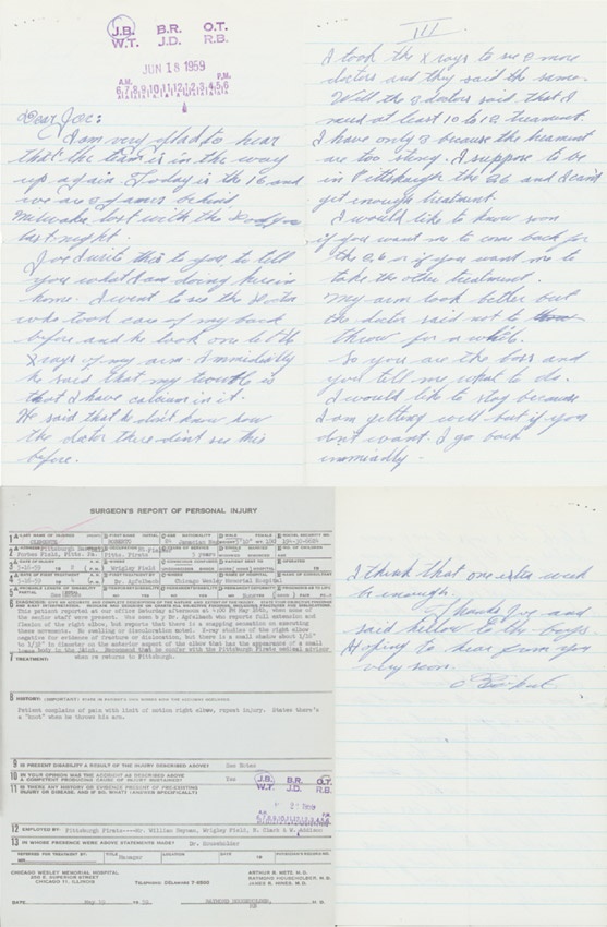 This marvelous 3-page letter from Roberto Clemente to Pirates GM, Joe Brown sheds light on his arm injury of 1959, giving incite into the relationship between Mr. Brown & the Puerto Rican superstar. Dated June 18, 1959, written in blue ink, it reads in part: “Dear Joe: …I write this to you to tell you what I am doing here in home. I went to see the doctor who took care of my back before and he took one little X-ray of my arm. Immediately he said that my trouble is that I have calcium in it. He said that he doesn’t know how the doctor there didn’t see this before. I took the X-rays to see 2 more doctors and they said the same. Well the 3 doctors said that I need at least 10 to 12 treatment. I have only 3 because the treatment are too strong. I suppose to be in Pittsburgh the 26 and I can’t get enough treatment. I would like to know soon if you want me to come back for the 26 or if you want me to take the other treatment. My arm look better but the doctor said not to throw for a while. So you are the boss and you tell me what to do. I would like to stay because I am getting well but if you don’t want I go back immediately. I think that one extra week be enough. Thank you and said hello to the boys…Roberto.” Pages measure 5x8”. EX-MT condition. Comes with the surgeon’s report of personal injury regarding Clemente’s arm, plus the response letter from Joe Brown to Clemente.