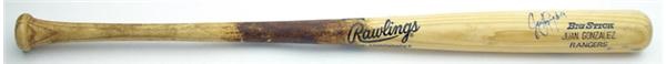 From the biggest gun in Texas comes this Rawlings “Big Stick” loaded with game use. Ball marks and bat scuffs litter the blue sharpie signed barrel around his block letter name while the midsection is caked with pine tar. Juan’s number “19” is written in black sharpie on both ends of the bat. On the knob in pen is “32 Gonzalez” with “484 A” and 195 92” stampings.