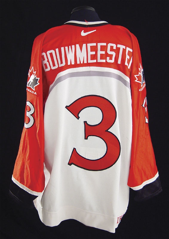 Florida Panther, Jay Bouwmeester is off to a great NHL career. The promising young defenseman was named to the Canadian Hockey League's All Rookie Team as a 16-year-old in 2000. Team Canada jersey was worn in 1999-2000, a Nike Air knit with dazzle cloth sleeves, size 56. Shows good game use with stick marks and board burns on both sleeves.