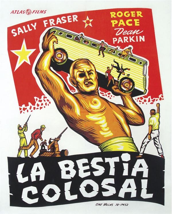 Silkscreen poster mounted on linen boasts the famous image of the Colossal Beast holding a bus of screaming people over his head. Rare, as it is a silkscreen from Cuba, printed in Spanish, "La Bestia Colosal." These were produced in small quantities, with even fewer surviving the ravages of time. Poster measures 31x38” including the linen backing. NRMT.