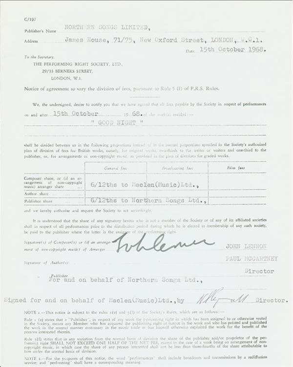 This is an original publishing agreement establishing the rights and royalty structure for a song entitled “Good Night” - 50% to Maclen Music Ltd (McCartney and Lennon) and 50% to the publisher, Northern Songs Ltd. This appears to be owned by Lennon and McCartney. The contract is signed by Lennon and dated October, 1968. Signature is in bold black felt tip and really stands out nicely on the page. Measures 8x10”. EX-MT.