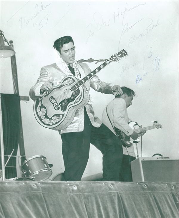 Fantastic black and white 8x10” photo (EX) captures a young Elvis in the midst of one of his memorable performances in Hawaii. Dated in blue ink, “Honolulu ‘57’”, and inscribed, “To Dr. Hoffman, from Elvis Presley, Thanks for everything”. The ink has faded significantly towards the end of the signing leaving “for everything” almost invisible. All other ink is 5/10. LOA from Dr. Lester Hoffman, Presley’s longtime dentist. The 7x12” handbill featuring a full length color image of the King is signed in blue ink, “To Dr. Hoffman, for your friendship, Sincerely Elvis Presley.” (8.5/10) Light wear to the top border but o/w EX-MT.