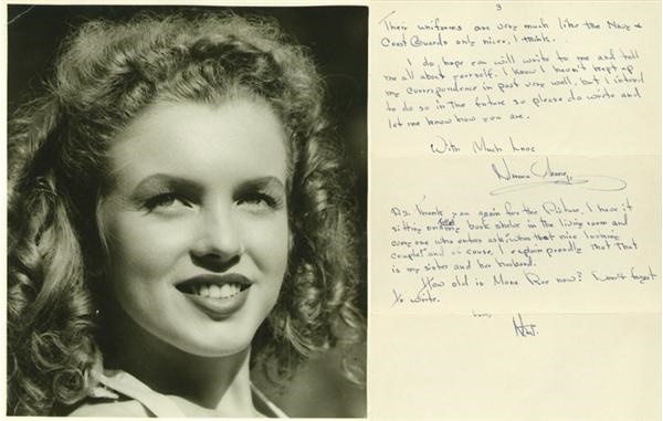 Three-page handwritten letter is a miraculous window into the unfinished life of the biggest Hollywood star of all time, Marilyn Monroe. Addressed to her half-sister, Berniece Miracle, it is fondly written on “Catalina Island United States Maritime Service” stationary. It is three pages altogether (first page written on both sides), penned by Monroe in the early 1940’s, while she was still known as Norma Jean Baker. Content refers to her first husband, Jimmie Dougherty, whom she married at age 16. She was writing from Catalina Island, while staying with her husband who had joined the Merchant Marines. In the letter Monroe reminisces about experiences with her mother as a young child, yearns for Berniece to join her off the coast of California, and describes a happy time in her life with her husband. Signed, “With Much Love, Norma Jean” and initialed after her added postscript, “NJ.” Black fountain ink is only slightly faded, and her signature grades a strong “7” out of a possible 10. Each page measures 7x10”. Original mailing folds, otherwise EX. Comes with 8x10” portrait of Berniece Miracle with her husband, Paris. This amazing piece originally emanates from the personal collection of Berniece Miracle.