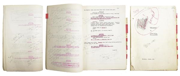 This mimeographed typescript is 147 pages. Script is three-hole punched and bound with three brass rivets. The different settings (“Ranch House, Car, Bar Mustanging” ) marked index tabs. The title page has some creasing and edge wear, as does the back page, and some margins are frayed inside, Marilyn Monroe used this script, she wrote notes, memorized her lines, this role, was everything she wanted and everything she feared so it is natural that there would be some wear. From the Marilyn Monroe Estate.