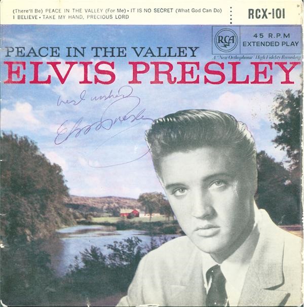 "Peace in the Valley" 45 EP released in 1957 is signed “Best Wishes Elvis Presley” in bold blue ballpoint front and center, on the jacket. The spectacular signature specimen is large and complete legible. This is a rare signed EP from the King of Rock n' Roll. Record jacket shows minor wear on the edges. No separations, tears etc. Record has some scratches.