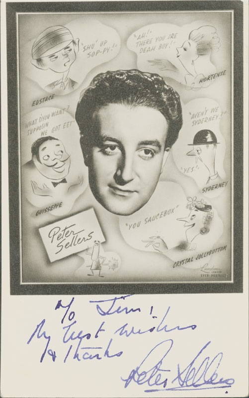 Interesting and early Peter Sellers autograph on 3.5x5.25” photographic card with all the “Goon Show” characters. Reads “To Jim! My best wishes & thanks Peter Sellers”. Signature and inscription executed neatly and nicely by Mr. Sellers. The Goon Show was the equivalent of Monty Python in the 1950's - early 60's. It was a critical and popular success in post-war England, otherwise a very bleak stark period devoid of laughter. Condition is EX-MT. This lot is not part of the Graham Chapman Collection.