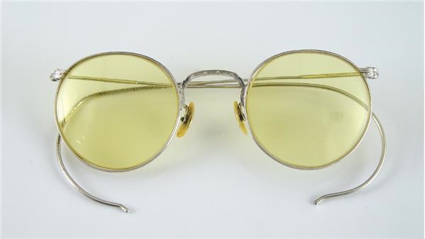 See through the eyes of one of the greatest minds in history. The round-rimmed fashion-setting spectacles John Lennon once wore. Much like the orange-tinted glasses on display at the Beatles Story Museum in Liverpool, these represent the very pinnacle of Beatles’ memorabilia. The silver frames surround the green tinted lenses which John Lennon himself gazed through. It is unknown exactly when and where he used these, but the included original cardboard box in which it was mailed give us a clue: the postmark of August 14, 1980 and handwritten address to “Yoko Ono Lennon c/o Sam Green.” Worn by Lennon from 1970-73. Obtained from Sam Green.