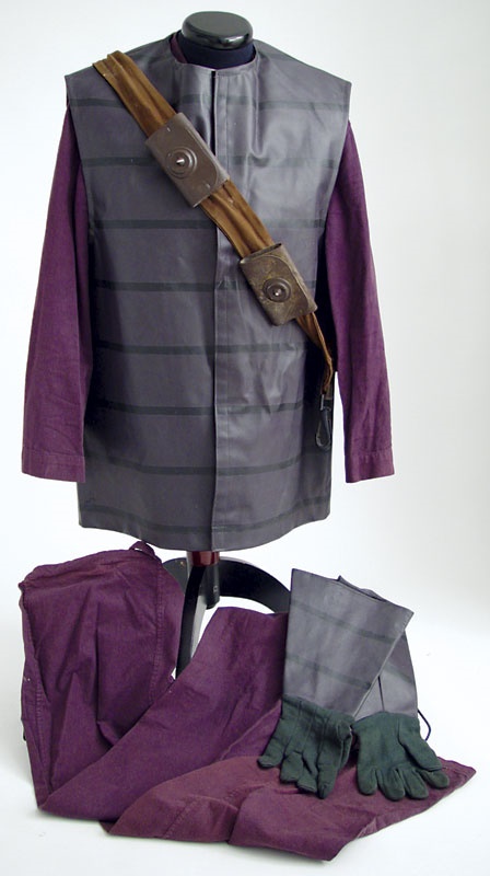 Includes: 1) Purple vinyl, black striped vest with center front Velcro closure. Tagging from “Westrern Costume Co , #2431-1 [size] 42”. 2) Pair of matching vinyl/cotton gloves. 3) Purple cotton four-button top with mandarin collar and patch pockets, tagged “Angelica [size] 42” in collar. 4) Purple cotton drawstring pants. 5) Brown utility belt with leather cases and steel clip.