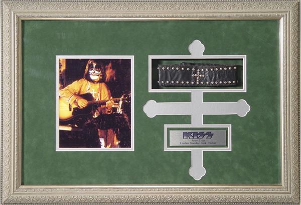Great black leather satanic studded chocker worn by Peter Criss in a magnificent framed display with a silver gothic cross and royal green velvet background. Also, in the display, is a brilliant color photo of Criss on stage wearing the chocker and a silver metal plate that reads “KISS Peter Criss Leather Studded Neck Choker”. Overall measurement is 20x29”. A truly stunning display for the avid collector.