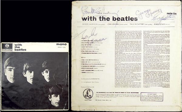 A British Parlophone "With the Beatles" LP, autographed by Paul McCartney, George Harrison, John Lennon and Ringo Starr on the back side of the album cover. The autographs are signed in dark blue ink, averaging "9/10", and the album cover itself is in overall Very Good condition. Accompanied by the original album.