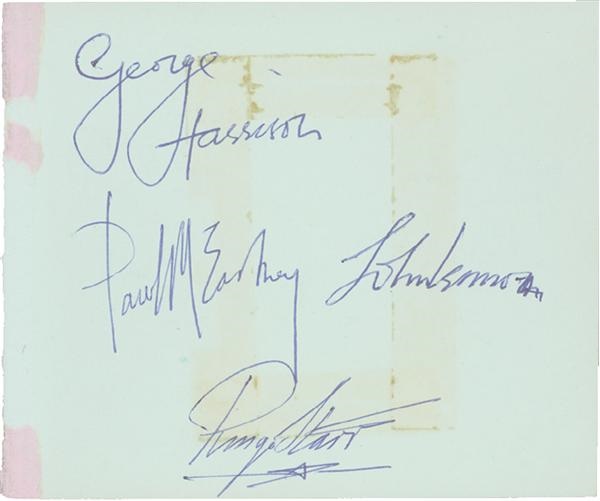 Album page boasts the bold blue ballpoint signatures of all four Beatles, penned entirely by George Harrison. These are nicely penned, very dark Beatles signatures, grading 8-9 out of a possible 10. Page itself (EX) has some tape residue. Looks as good as a $5,000 set to the naked eye.
