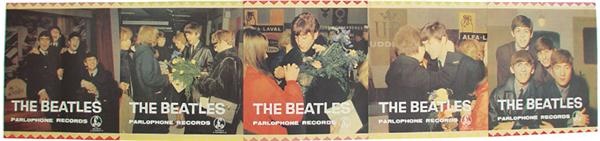 Big Beat Extra British Promotional Poster boasts “The Biggest Pop Wall Panel In The World”. Each panel has a great image of the Beatles circa 1965. Measures 48x13.25”. Condition is EX, just some pinholes on perimeter; folded poster is clean and has an amazing early look.
