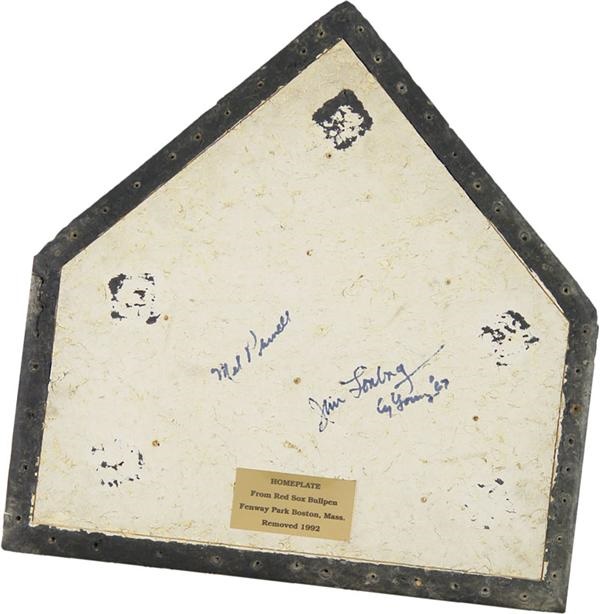 Taken from Fenway after the 1992 season this heavy rubber homeplate has seen its fair share of action. Witness to countless superstar hurlers such as Roger Clemens and present during Boston’s dramatic seven-game series with the Mets in ’86, each dent to its surface can tell a tale. Signed in blue sharpie by two players including the 1967 Cy Young winner, Jim Lonborg. And complete with a gold plaque that reads, “Homeplate From The Red Sox Bullpen Fenway Park Boston, Mass, Removed 1992”.