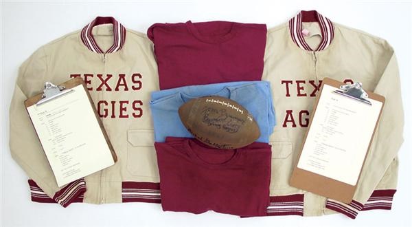 A group of props and wardrobe from the hit ESPN film "The Junction Boys" starring Tom Berenger as legendary college football coach Paul "Bear" Bryant. The collection includes: a practice football signed by Tom Berenger, Director Mike Robe, Producer Michal Gallant, and stars Fletcher Humphrys, Ryan Kwanten and Bernard Curry; a powder blue jersey worn by character "Mike Hess"; a maroon jersey worn by character "Pine"; a maroon jersey worn by Fletcher Humphrys as quarterback "Skeet" Chaney; (2) Texas Aggies coaches jackets; and (3) clipboards with various drills and exercise itinerarys.