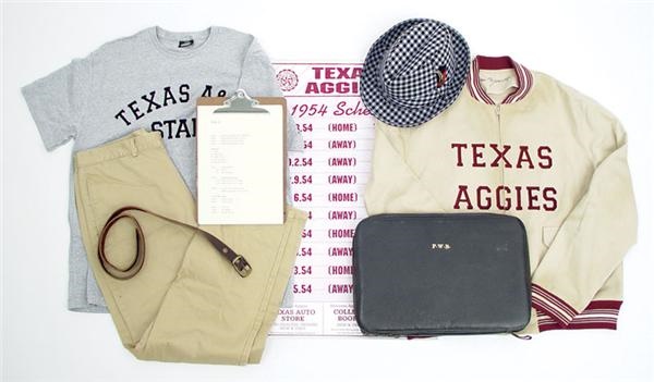 Tom Berenger's intense portrayal of legendary college football coach Paul "Bear" Bryant in the 2002 ESPN movie "The Junction Boys", is sure to be a fan favorite for years to come. Offered is a collection of props and wardrobe used and worn by Berenger in the popular film, including: Bear Bryant's trademark checkered hat; a leather folio with the initials "PWB" emblazoned in gold, with numerous newspaper articles, photographs, football "plays", etc.; Bryant's clipboard with "Day 1" itinerary; 1954 Texas A & M Schedule Poster; Bryant's Texas Aggies jacket signed by Berenger; Bryant's Texas A & M T-shirt, pants and leather belt.