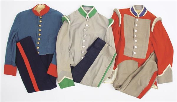 Offered are 3 different costumes from “The Alamo,” starring John Wayne as Davy Crockett. This film was also John’s directorial debut, a favorite among Western buffs. The costumes are all Mexican military uniforms, dragoon, lancer & artillery. Each consists of a jacket & pants, intricately decorated and beautifully made of wool and other natural fibers. The jackets are EX or better. Two pairs of pants show some wear, most likely from use in battle scenes. One of the costumes has size 42 printed on the silk label at the collar. One costume reads “Republic Pictures,” as the film was initially to be made by them. In the end, it cost John Wayne his long-time association with Republic Pictures, who refused to meet his terms.
