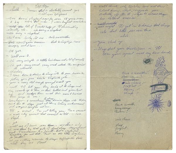 A hilarious, 1 page (front and back) handwritten comedy sketch composed by Monty Python founder Graham Chapman, and performed on the legendary, "At Last the 1948 Show." Entitled "Sheepdog", the sketch is completely written in Graham Chapman's handwriting. A rare insight into Chapman's creative process. From the personal archives of Graham Chapman.