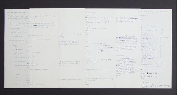 A hilarious, 5 page handwritten comedy sketch composed by Monty Python founders John Cleese and Graham Chapman, and performed in episode 6 of the 3rd season of "Monty Python's Flying Circus". Entitled "Live’ documentary on mollusks", the sketch is completely written in John Cleese's handwriting, and exhibits numerous corrections. One can imagine Cleese and Chapman deep into the creative process, snickering away and acting out their ideas, while Cleese writes it all down in his distinctive diminutive hand. From the personal archives of Graham Chapman.