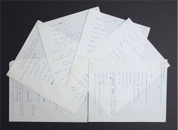 A hilarious, 5 page handwritten comedy sketch composed by Monty Python founders John Cleese and Graham Chapman, and performed in episode 3 of the 4th season of "Monty Python's Flying Circus". Entitled "The Public Are Idiots", the sketch is completely written in John Cleese's handwriting, and exhibits numerous corrections. One can imagine Cleese and Chapman deep into the creative process, snickering away and acting out their ideas, while Cleese writes it all down in his distinctive diminutive hand. From the personal archives of Graham Chapman.