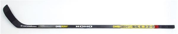Great Koho Core Beam 9 helped future Hall of Famer, Jaromir Jagr score 47 goals for a total of 95 points in 1996-97, playing in just 63 games. Shows nice use with heavily curved blade, completely intact and taped in black. Top of handle wrapped in black tape with a strip of red below. Stamped, “Jagr Sep 1996.” Signed by Jagr on the left side in black felt tip.