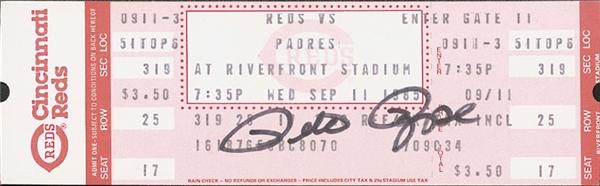 On September 11 in front of his home crowd at Riverfront and batting lefthanded, Pete hit a line single to left off the Padres' Eric Snow for hit number 4,193 to pass Ty Cobb. From that historic evening we offer three NRMT unused tickets signed by Rose himself. Each of the black sharpie signatures grades an 8/10. A terrific trio!