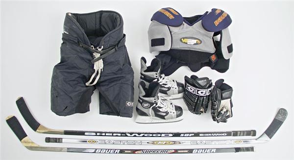 Collection of game used items from the mighty Colorado Avalanche includes the following:  Rob Blake’s Bauer Vapor 10 skates, in game ready shape; Rob Blake’s Bauer Supreme 3030, stamped "02110103"; Greg DeVires autographed Easton Synergy stick; Eric Messier’s Sher-Wood SOP; Eric Messiers shoulder pads, and tough guy Jeff Parker's pants.