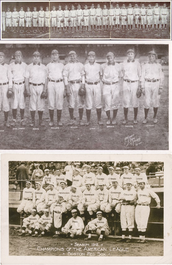A great pair of vintage 1909 & 1912 postcards. First is a tri-fold panorama of the 1912 Pittsburgh Pirates w/ H. Wagner (measures 14x3.25” when opened). Creased along folds, and lightly toned. Second is the 1912 Boston Red Sox real photo postcard w/ Speaker, Wood, Stahl, etc. Both postcards with original mailing stamps and postmarks, plus writing on versos, o/w EX.