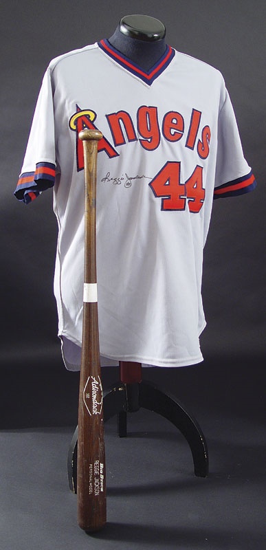 A bonus pair of premier game used pieces from Mr. October: Adirondack Big Stick 288 was used in 1980. Dark finish to the bat, covered with heavy use from Reggie Jackson’s career-defining stint with the New York Yankees. “288 RJ” stamped on knob. California Angels road gray pullover style jersey is signed in thin black felt tip on the front. “Angels 44” fills the front in red on navy tackle twill. Verso is “Jackson 44”. Left sleeve with embroidered state of California patch. Front tail tagging is W.A. Goodman & Sons [size] 48”. Nice use.